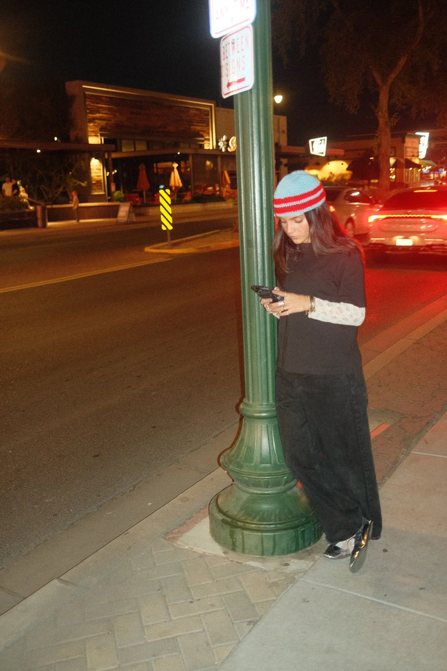 Each beanie will have a blue tab on it and that will mark the back of your beanie.